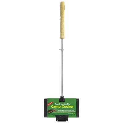 Cook twice as many of your favorite campfire treats in the Double Cast Iron Camp Cooker. Made from durable cast iron, this Double Cast Iron Camp Cooker from Coghlan’s offers a convenient way to toast sandwiches, grill meats, and cook delicious desserts over an open fire or nestled between coals. The Camp Cooker has a two-part hinge and wooden handles that unscrew making cleaning easy and it can also be broken down during transportation. The cast iron comes pre-seasoned, so it features a non-stick finish that needs to be renewed after each use. Features a stay cool wooden handle that is easy to use and latches together with an S hook around each handle. The cast iron plates are heat resistant and will not melt when used over an open fire.